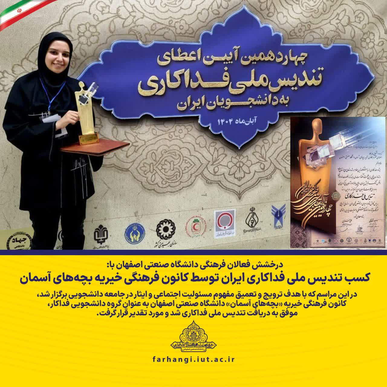 در این مراسم که با هدف ترویج و تعمیق مفهوم مسئولیت اجتماعی و ایثار در جامعه دانشجویی برگزار شد، کانون فرهنگی «بچههای آسمان» دانشگاه صنعتی اصفهان به عنوان گروه دانشجویی فداکار، موفق به دریافت تندیس ملی فداکاری شد و مورد تقدیر قرار گرفت.